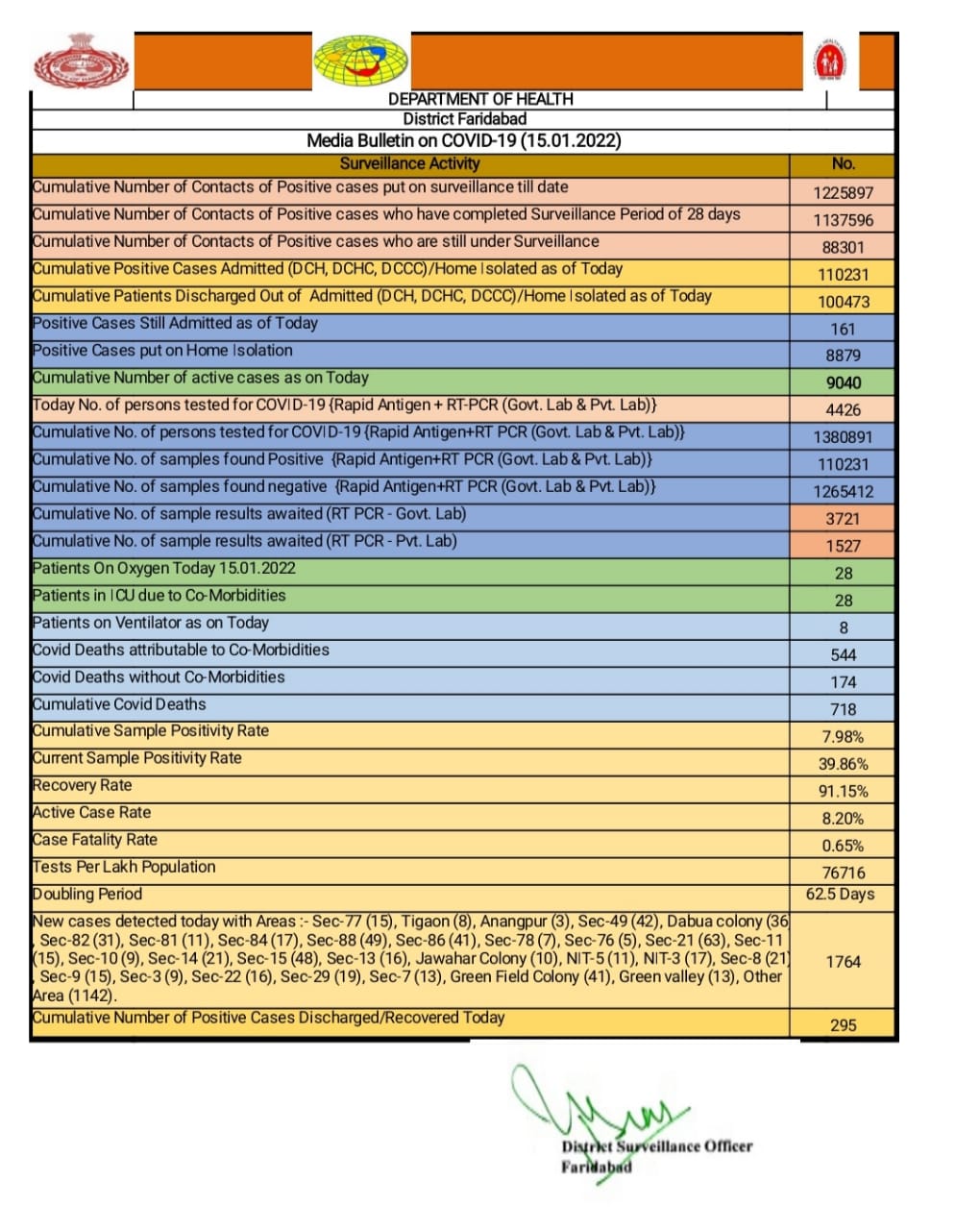 फरीदाबाद, 15 जनवरी ( अतुल्य लोकतंत्र ): उपायुक्त जितेंद्र यादव ने बताया कि जिला में आज शनिवार को कोरोना वायरस के 1764 मामले पोजिटिव आए है। अच्छी बात यह है कि 265 मामले ठीक होंने पर अपने घर में भेज दिए गए हैं। वहीं शनिवार को जिला में रिकवरी रेट भी 92.15 प्रतिशत पर पहुंच गया है। उपायुक्त जितेन्द्र यादव ने बताया कि कोरोना पोजिटिव का 161 केस अस्पताल में भर्ती है। जबकि होम आईसोलेशन पर जिला मे 8879 लोगों को रखा गया है तथा एक्टिव केसों की संख्या भी 9040 हो गई है। जबकि कई लोग कोरोना को मात देकर स्वस्थ हो चुके हैं। जिला में कोरोना संक्रमण की रफ्तार पर ब्रेक लगाने के लिए टेस्टिंग और वैक्शीनेशन पर जोर दिया जा रहा है। जिला में पिछले 24 घंटे में 4426 लोगों टेस्ट किए गए। जबकि अब तक जिला फरीदाबाद में 1380891 लोगों ने अब तक टेस्ट करवाया गया। इनमें से 110231 लोग कोराना पोजिटिव पाए गए। जबकि 1265412 लोग नेगेटिव मिले। अब तक जिला में 3721 लोगों के रिजल्ट आने बाकी है। जिला फरीदाबाद में 28 केस वैंटीलेटर और 28 केस आक्सीजन पर है। जिला में सैम्पल पोजिटिव रेट 7.98 प्रतिशत है। जबकि रिकवरी रेट 91.15 प्रतिशत है। जिला मे एक्टिव केस रेट 8.20 प्रतिशत है। इस महामारी को फैलने से रोकने के लिए टीकाकरण भी जोर शोर से किया जा रहा है। कोरोना रोधी वैक्सीन लगातार लगाई जा रही है। उपायुक्त जितेन्द्र यादव ने फरीदाबाद जिला वासियों से अपील की है कि वे अब भी निरन्तर कोरोना को मात देने के लिए सावधानी लगातार बरतते रहें और कोशिश करें कि अपने घर के अंदर ही रहे। जब तक बहुत जरूरी ना हो, तब तक घर से बाहर ना निकले और बाहर निकलते समय अपने मुंह और नाक को कवर करते हुए फेस मास्क का प्रयोग अवश्य करें। इसके अलावा, एक दूसरे के बीच दो गज की दूरी जरूर रखें। हाथों को बार बार साबुन से धोते रहें या सनेटाइजर करते रहे। कोरोना के बारे में कोई भी जानकारी लेनी हो तो कॉविड हेल्पलाइन नंबर 1950 पर डायल करें जो कि सप्ताह के सातों दिन 24 घंटे संचालित की जा रही है। इसके अलावा, जिला प्रशासन ने मोबाइल नंबर पर व्हाट्सएप चैट बोट के माध्यम से सूचनाएं देने की व्यवस्था की गई है। सरकार द्वारा जारी की गई कोविड-19 की हिदायतों की पूर्ण रूप से पालना सुनिश्चित करें। कोरोना के जिला नोडल अधिकारी डा. रामभक्त ने बताया कि जिला स्वास्थ्य विभाग के द्वारा जारी स्वास्थ्य बुलेटिन के अनुसार फरीदाबाद जिला में अब तक 1225897 लोगों को अब तक सर्वेलांस पर रखा गया है। जिन्होंने 28 दिनों का सर्वेलांस पूरा कर लिया है उनकी संख्या 1137596 हो गई है। इसके अलावा 88301 कोराना पोजिटिव लोगों को सर्वेलांस पर रखा गया है।