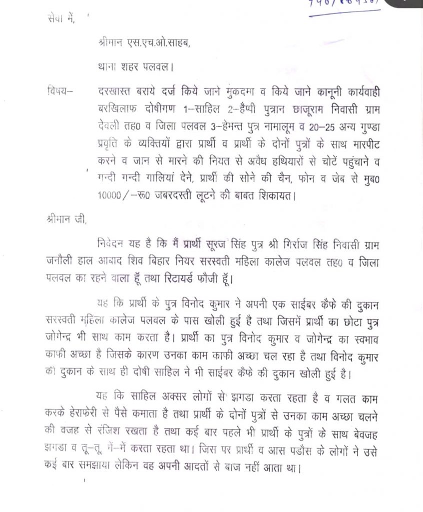 शिकायतकर्ता सूरज सिंह ने यह भी बताया कि उनके दोनों बेटे शिव विहार पलवल में साइबर कैफे की दुकान चलाते हैं । उन्होंने कहा कि उन्होंने कहा कि दोषी साहिल भी उनके पड़ोस में साइबर कैफे की दुकान चलाता है ।