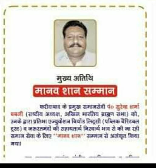 फरीदाबाद (अतुल्य लोकतंत्र)/दीपक शर्मा शक्ति: अखिल भारतीय ब्राह्मण समाज के राष्ट्रीय अध्यक्ष पं सुरेंद्र शर्मा बबली को ( रिदम ग्रुप ऑफ टेलेंट) धार्मिक और सामाजिक सरोकारों के क्षेत्र में उनके द्वारा किए जा रहे कामों के लिए उन्हें ” मानव शान सम्मान” से नवाजा गया है।