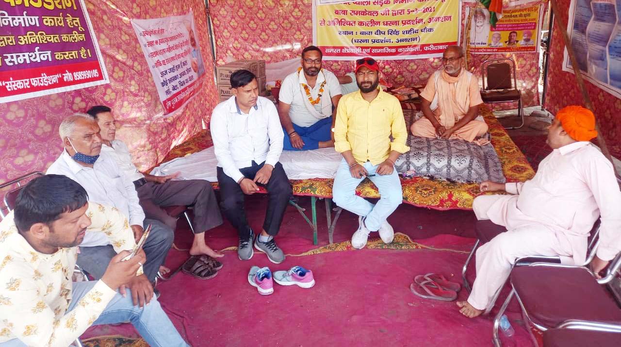 फरीदाबाद, 4 अप्रैल : प्याली-हार्डवेयर सडक़ निर्माण की मांग को लेकर धरने पर बैठे अनशनकारी बाबा रामकेवल के नेतृत्व में आज दूसरे दिन भी समाजसेवी अभिषेक गोस्वामी भूख हड़ताल पर डटे रहे। इस दौरान क्षेत्र की विभिन्न सामाजिक संस्थाओं के पदाधिकारियों ने बाबा रामकेवल व अभिषेक गोस्वामी को समर्थन किया।