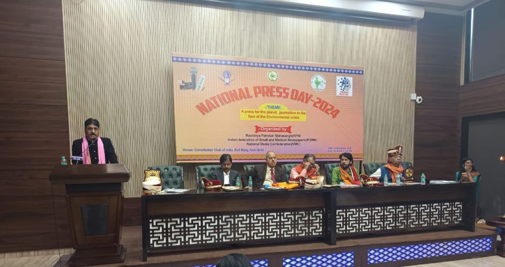 नई दिल्ली ( अतुल्य लोकतंत्र) राष्ट्रीय पत्रकार महासंघ द्वारा पूर्व निर्धारित नेशनल प्रेस डे के अवसर पर नई दिल्ली स्थित कांस्टीट्यूशन क्लब के कार्यक्रम का आयोजन किया गया। कार्यक्रम में 22 राज्यों के पत्रकारों द्वारा प्रतिभाग किया गया। इस दौरान कार्यक्रम के उड़ीसा के जजपुर से राज्य सभा सासंद रबिंद्र नारायण बेहरा द्वारा अपने उद्बोधन में कहा गया देश के लोकतंत्र के लिए देश के चौथे स्तंभ का होना बेहद आवश्यक है। पत्रकारों की डिमांड पर सरकारों को ध्यान देकर मांगो पर विचार करना भी चाहिए। उन्होंने कहा कि पत्रकारों को भी गिरते अपने प्रोफेशन पर ध्यान दिया जाना बेहद आवश्यक है। उन्होंने पत्रकारों को कहा आप सच्चाई सामने लाने वाले योद्धा है। सच्चाई देश के सामने लाते रहे। आपकी डिमांड को पूरा किए जाने का हम समर्थन देते है।