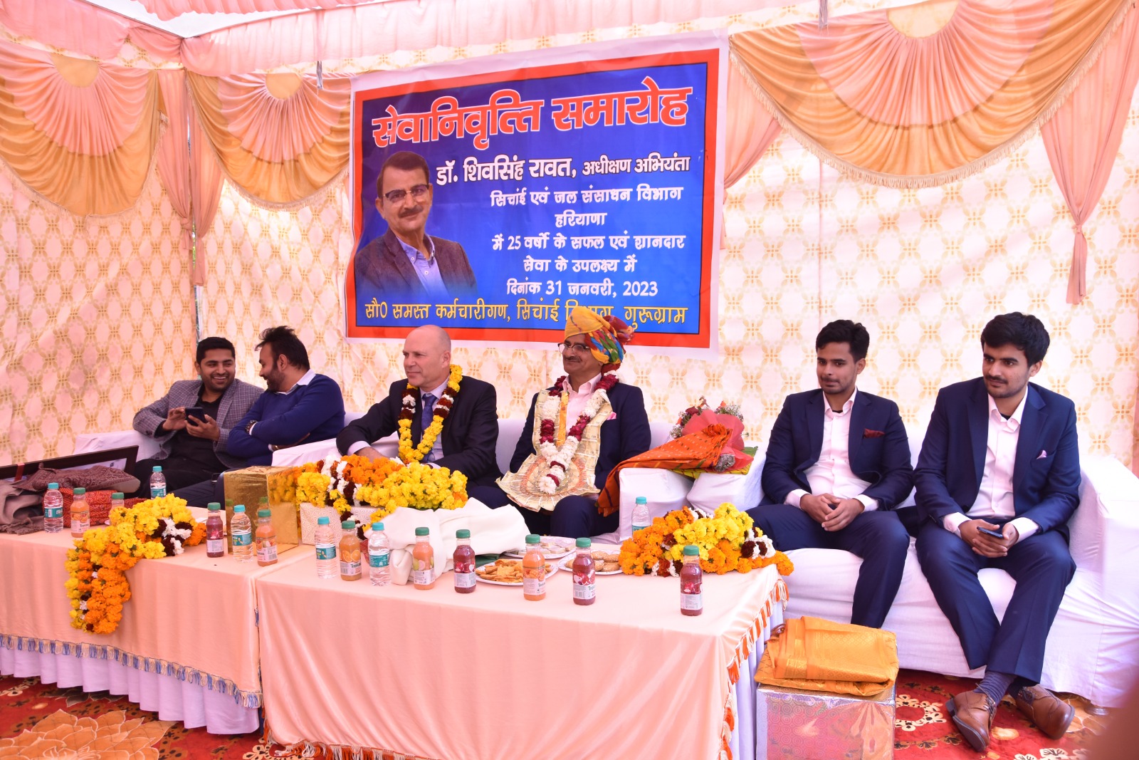 पलवल ( अतुल्य लोकतंत्र ) मुकेश बघेल/पलवल ज़िले के ऐतिहासिक गाँव बहीन निवासी डॉ शिवसिंह रावत, अधीक्षण अभियंता, सिंचाई एवं जल संसाधन विभाग गुरुग्राम के सेवानिवृत्ति के अवसर पर विभाग के कर्मचारियों द्वारा कैनाल कालोनी गुरुग्राम में भव्य विदाई समारोह का आयोजन किया। डॉ. रावत विभाग में 25वर्ष की सेवा देकर मंगलवार को सेवानिवृत्त हुए हैं। इसलिए उनके सम्मान कार्यक्रम में विभाग के कर्मचारियों, नहर कॉलोनी निवासियों एवं कई पूर्व अधिकारियों ने उन्हें भावभीनी विदाई दी।