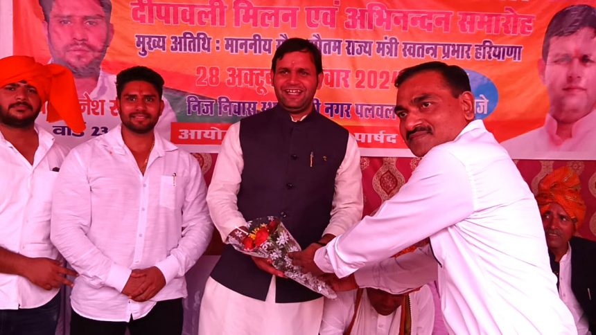 Palwal/ पलवल में सैनी समाज द्वारा वार्ड नंबर 23 में दीपावली मिलन एवं अभिनन्दन समारोह का आयोजन किया गया। समारोह में खेल राज्य मंत्री (स्वतंत्र प्रभार) गौरव गौतम ने मुख्य अतिथि शिरकत की। इस अवसर पर खेल राज्य मंत्री गौरव गौतम का फूलमाला डालकर भव्य स्वागत किया गया।