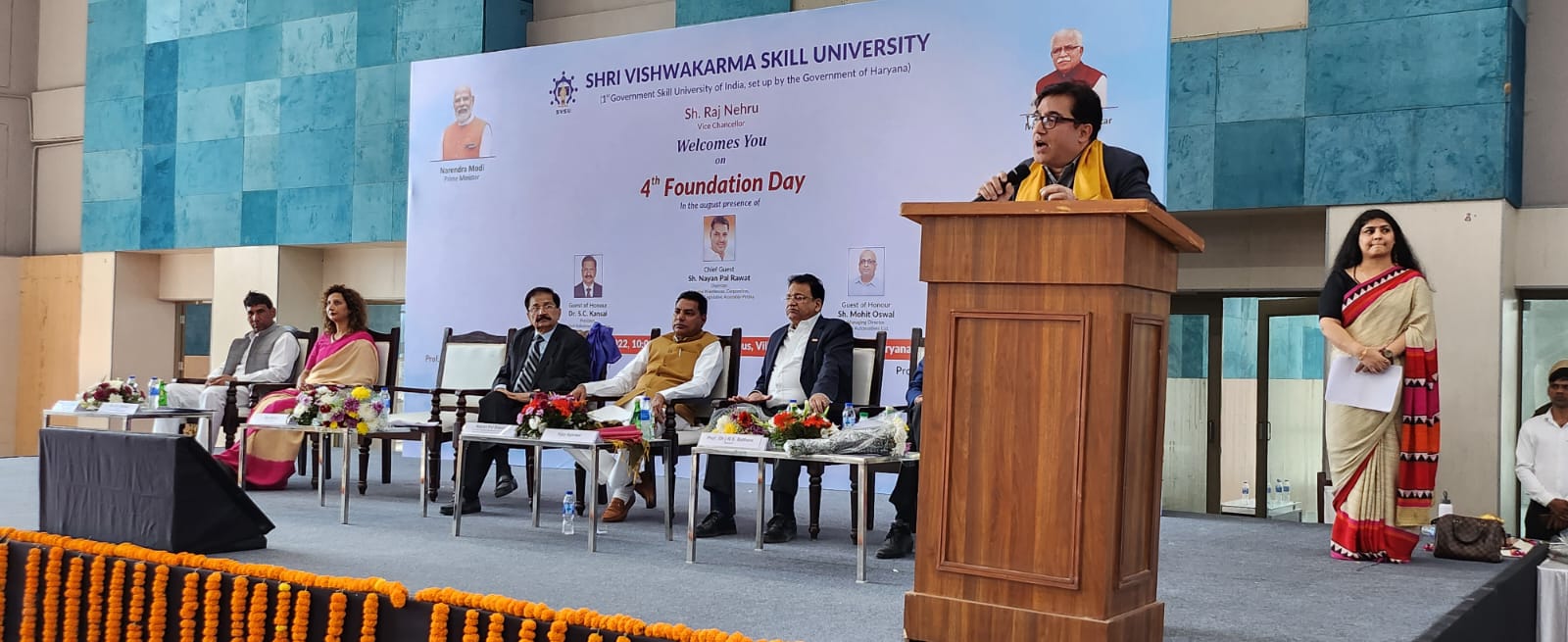 पलवल (अतुल्य लोकतंत्र) मुकेश बघेल/ भारत के इस प्रथम राजकीय कौशल विश्वविद्यालय की नींव माननीय प्रधानमंत्री श्री नरेंदर मोदी जी द्वारा हरियाणा के मुख्यमंत्री श्री मनोहर लाल जी की उपस्थिति में १९ नवंबर २०१८ को रखी गयी थी। बहुत कम समय में इस विश्वविद्यालय ने देश विदेश में अपनी पहचान बनाई है। आज विश्वविद्यालय के चौथे स्थापना दिवस के अवसर पर आयोजित कार्यक्रम में मुख्य अतिथि के रूप में हरियाणा वेयरहाउस कारपोरेशन के अध्यक्ष एवं पृथला से विधानसभा सदस्य श्री नयनपाल रावत जी उपस्थित रहे। इसके अतिरिक्त कार्यक्रम के विशिष्ट अतिथि के रूप में पलवल इंडस्ट्रियल एसोसिएशन के प्रेजिडेंट डॉ एस सी कंसल जी मौजूद रहे। कार्यक्रम की शुरुआत कुलगीत के द्वारा हुई। इसके पश्चात सरस्वती वंदना एवं दीप प्रज्ज्वलित किया गया। विश्वविद्यालय के कुलसचिव प्रो आर एस राठौर ने अपने स्वागत वक्तवय द्वारा सभी का स्वागत किया। तत्पश्चात विश्वविद्यालय की डीन एकेडेमिक्स प्रो ज्योति राणा ने विश्विद्यालय की वार्षिक रिपोर्ट द्वारा गत वर्ष में विश्वविद्यालय द्वारा किये गए सभी कार्यों का विवरण दिया।
